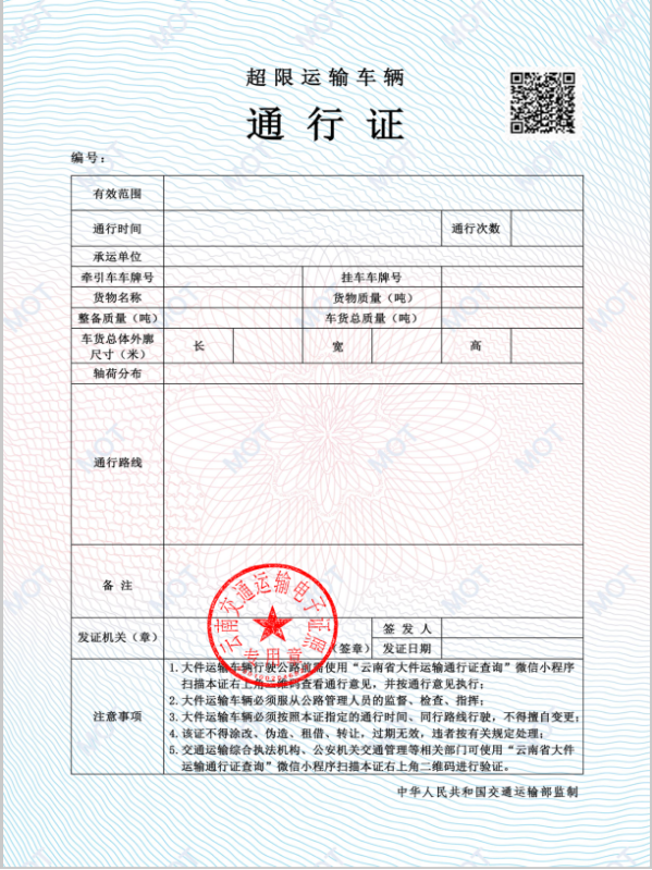 3.按《超限运输车辆通行证》规定的时间、路线、时速行驶;如遇雨、雪、雾等恶劣天气,寻找安全的避险场所停靠,待天气好转后通行;如遇临时交通管制等突发因素不允许车辆通行的,服从有关规定。