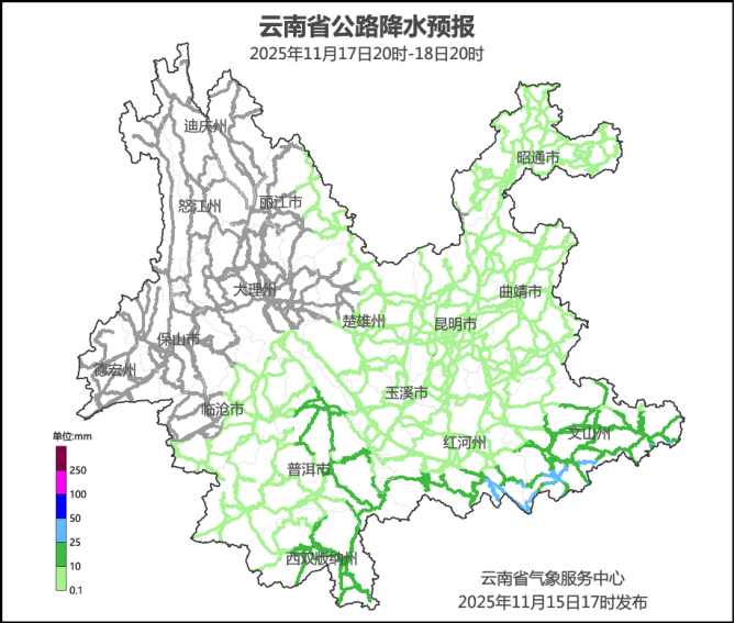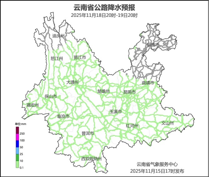 11月18日20时至11月19日20时,各路段无大雨以上量级降水影响。