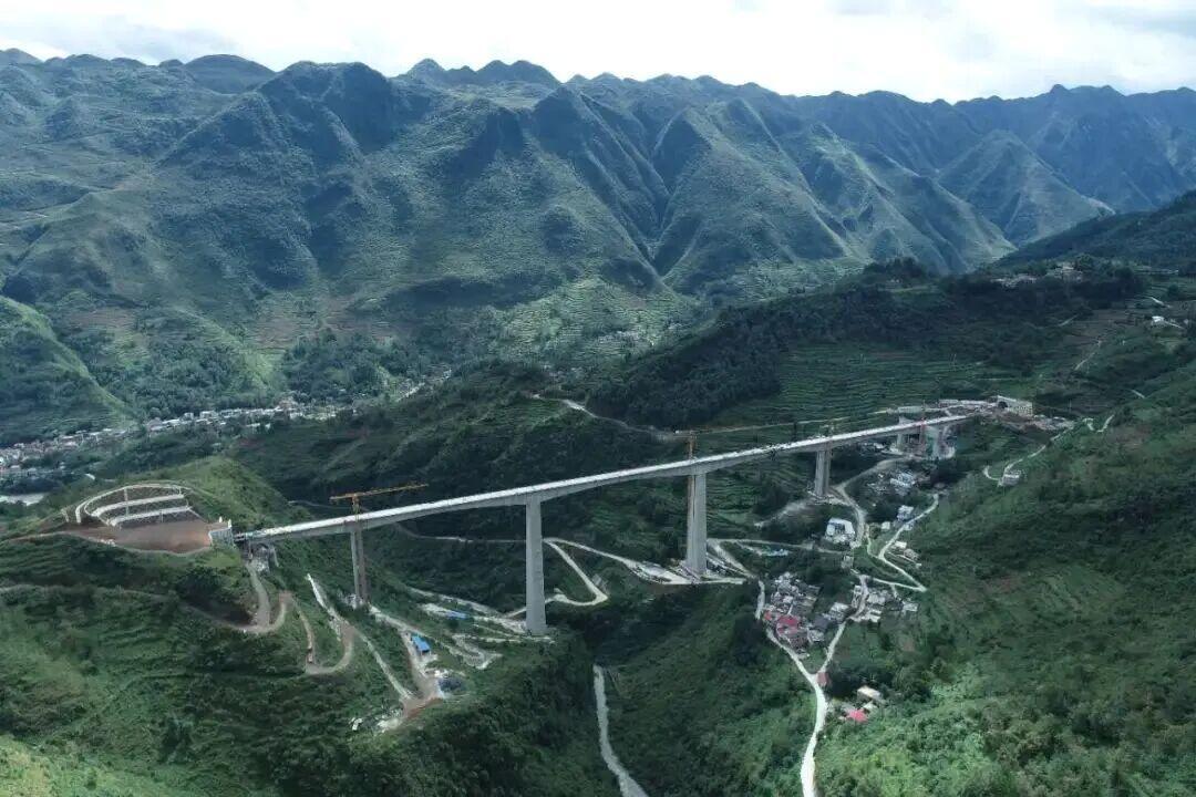 据了解,小龙潭特大桥位于彝良县境内,全长770米,设计时速350公里。大桥主桥采用刚构连续梁结构,最大跨径168米,最高桥墩124米,具有“大跨高墩”的显著特点。大桥桥址处于深切峡谷地带,两岸地势陡峭,地质条件复杂,岩溶发育强烈,属于全线施工难度最大的桥梁工程之一。