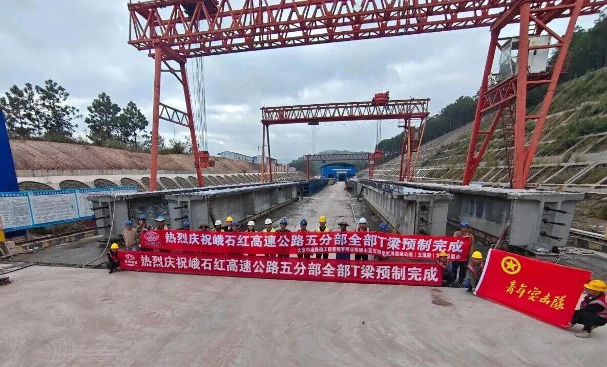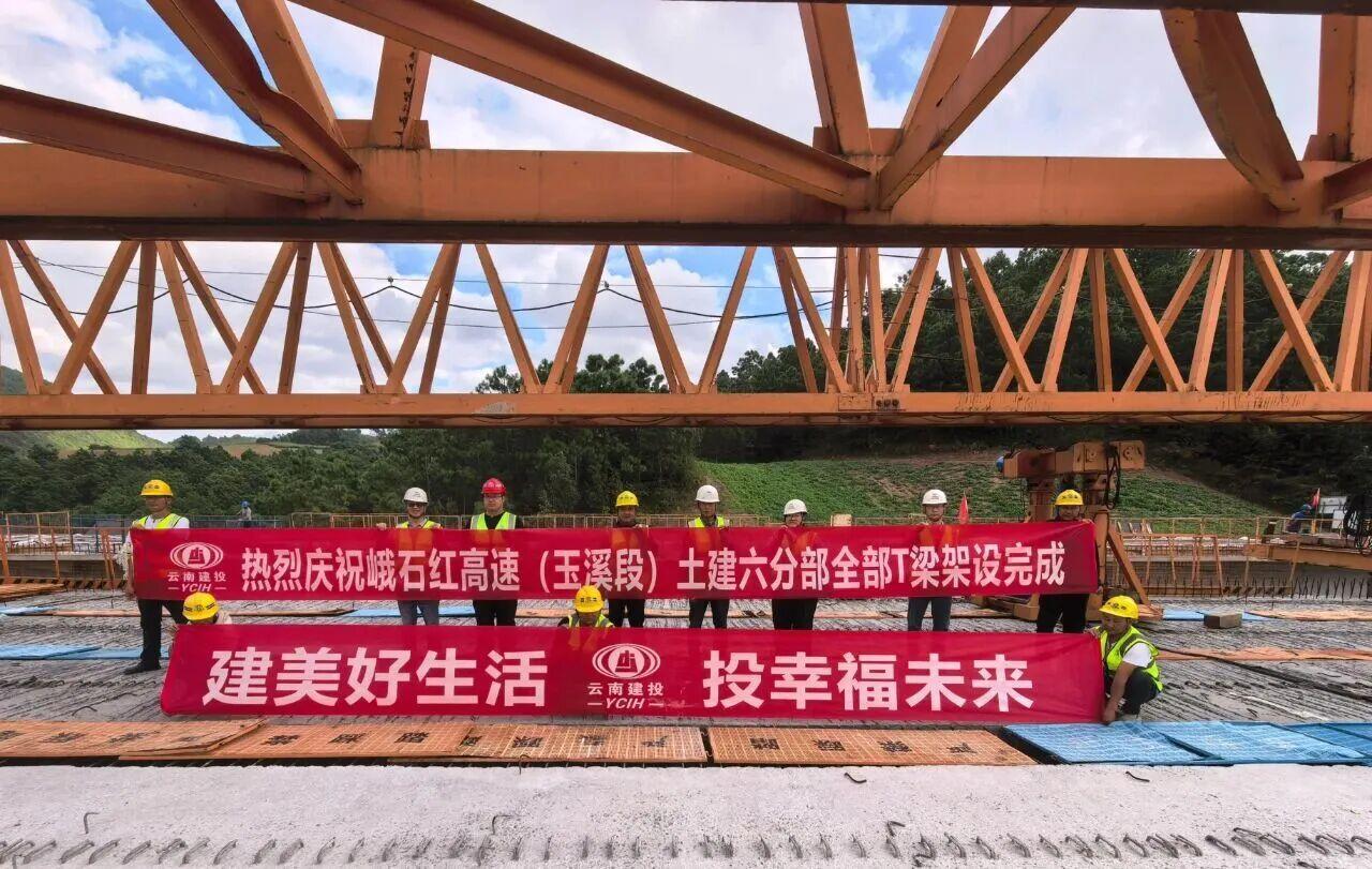 同日,峨石红高速(玉溪段)土建六分部完成全部T梁架设任务,实现主线贯通。