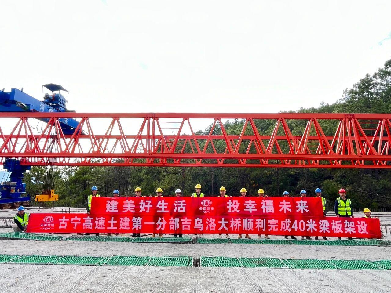 同日,随着最后一片40米T梁精准安装到位,古宁高速土建一分部吉乌洛大桥梁板架设任务全部完成。