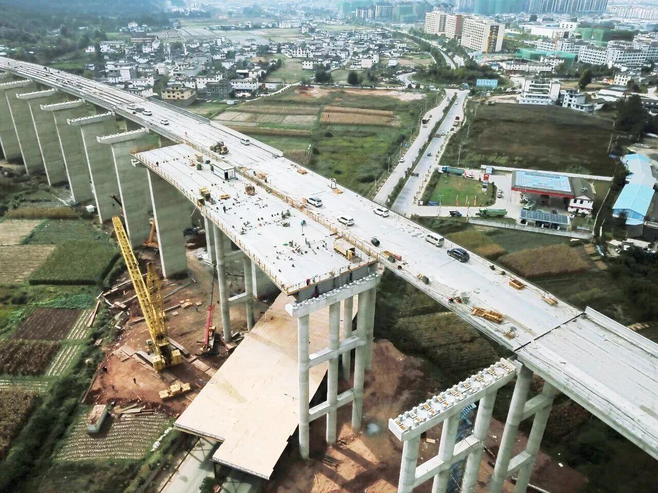 华宁南互通作为澄华高速的控制性工程,承担着连接弥玉高速的重要功能。互通共设计现浇箱梁9联,设计浇筑混凝土6100余立方米,涵盖预应力混凝土现浇箱梁和普通混凝土箱梁两种结构形式,工程具有现浇支架高、箱型结构多样等特点。
