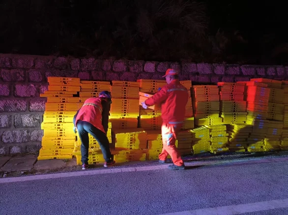 事故现场,寒风吹得人瑟瑟发抖。抢险队伍和交警一道拉起安全警戒带,在事故路段前后合理布设警示灯、反光锥等安全标志,并安排专人配合引导过往车辆有序绕行,坚决防范二次事故发生。有的救援人员徒手捡拾清理散落货物;有的先均匀撒布木屑吸附路面浮油,快速阻断油污扩散增强路面摩擦力;有的操作清障车吊臂精准作业......夜色中,交警的荧光绿、抢险人员的反光背心在车灯映照下格外醒目,他们弯腰作业、俯身清理的身影与呼出的白气交织,构成寒夜中最动人的抢险图景。
