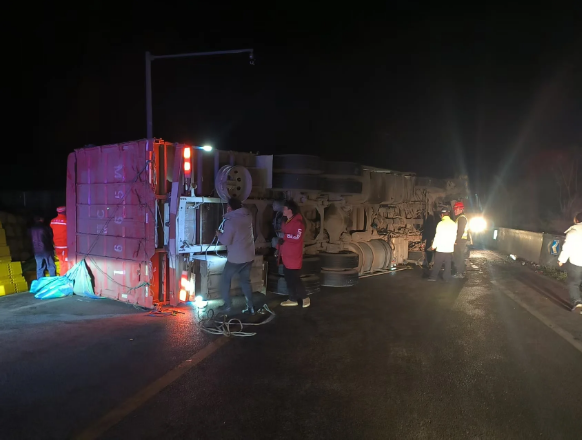 经过3小时的连续奋战,事故现场散落货物全部清理完毕,泄漏油污得到彻底处置,侧翻货车成功拖离现场,中断的道路交通恢复正常通行。