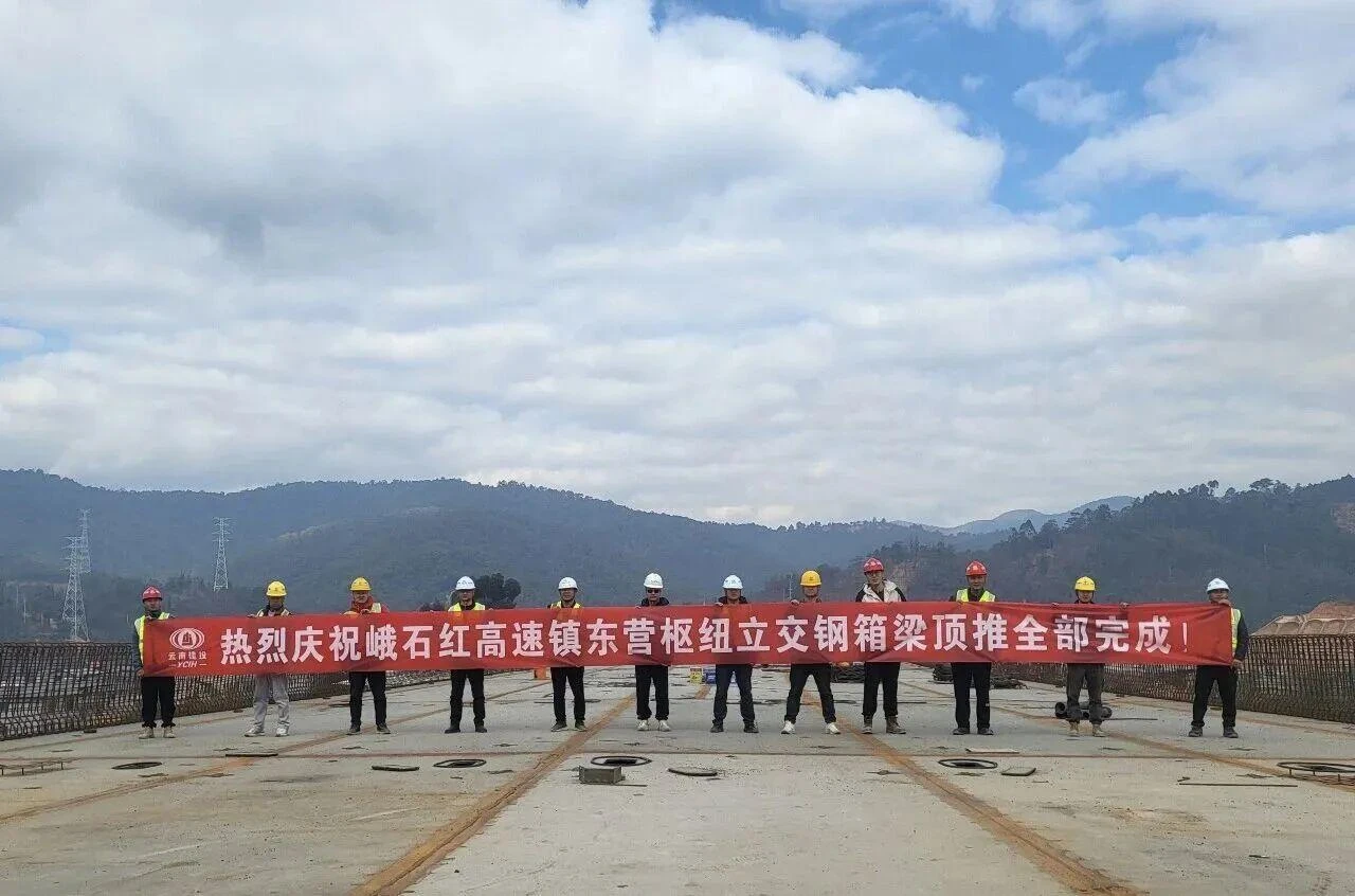 12月23日,随着镇东营枢纽立交A匝道桥钢箱梁平稳顶推就位,峨石红高速(玉溪段)全线钢箱梁顶推施工任务圆满完成。至此,项目桥梁工程除附属工程外已全部完工。