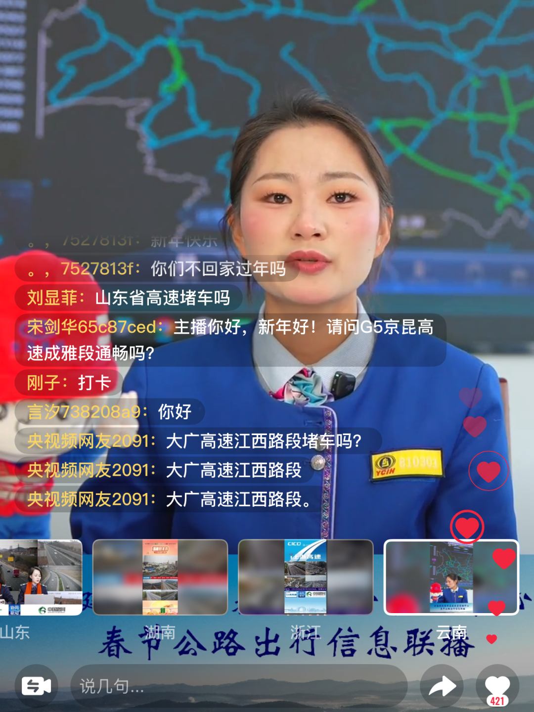 除了一线的暖心坚守,集团各高速项目还以精细化管理、智慧化防控为春运保畅加码,让安全保障更精准、更全面。运管中心参与探花 部路网中心全国出行信息联播6次,在抖音及央视频双平台开展路况咨询直播12场,直播时长36小时,观看人次超10万人次。元蔓高速玉溪段监控中心化身高速路网的“智慧大脑”,工作人员24小时紧盯屏幕,实时监测车流变化、精准调度管控。