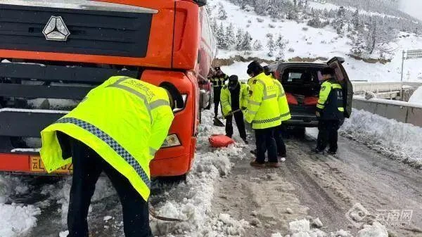 针对不同类型被困车辆,执法人员实施了分类精准救援。对于大型粉煤灰运输货车,执法人员仔细检查轮胎、制动系统等关键部件,清理车轮夹缝积雪,铺设防滑麻袋增强抓地力,协助车辆调整姿态后引导其平稳脱困。对于小型客车,执法人员则合力将车辆推行至无冰安全路段,并现场向驾驶员讲解雪天行车注意事项,提醒大家减速慢行、保持车距。在紧张救援的同时,执法人员还主动为滞留司乘人员送上矿泉水、面包等应急物资,安抚焦虑情绪,对有特殊需求的群众提供一对一帮扶,让春雪中的道路充满温情。