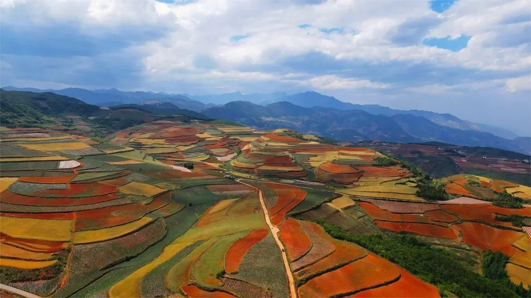 东川红土地,褐黄与赭红的土壤、绿色的作物、金黄的日落与雪白的云形成了层次鲜明的色彩对撞,是自然与千年农耕文明共同孕育出的瑰丽风光。